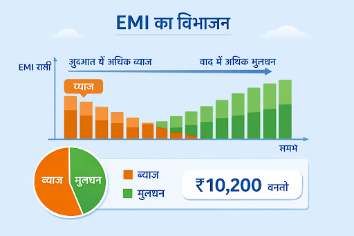 इसका मतलब है कि आप हर महीने करीब ₹10,200 चुकाएँगे, जिसमें शुरुआत में ब्याज का हिस्सा ज़्यादा होगा और धीरे-धीरे मूलधन का हिस्सा बढ़ता जाएगा।