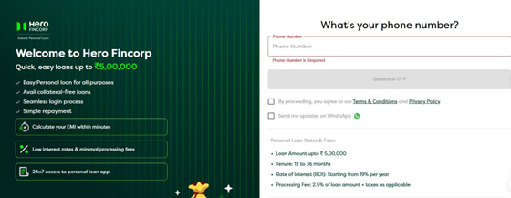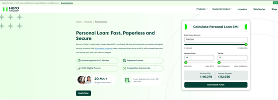 You can access an instant loan from verified lenders such as Hero FinCorp for amounts between Rs 50,000 and Rs 5 lakh. The entire loan process is online and paperless, with no physical documents or branch visits required.