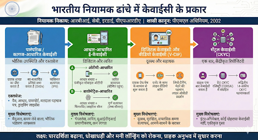 केवाईसी की प्रक्रिया को अलग-अलग सेवाओं, तकनीकी सुविधाओं और उपयोगकर्ता की सहूलियत के अनुसार विभिन्न रूपों में लागू किया जाता है। इन्हीं जरूरतों को ध्यान में रखते हुए केवाईसी को कई प्रकारों में वर्गीकृत किया गया है।