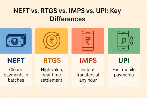 Amit was new to net banking and wanted to send some money on his phone. When he opened the app, four payment options appeared: NEFT, RTGS, IMPS, and UPI. Although he had seen these options before, he never really thought about what made them different.