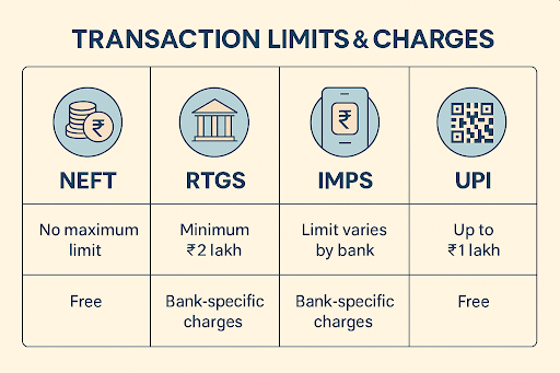 Each payment method has its own use. IMPS and UPI work well for quick, everyday transfers. NEFT suits planned payments, while RTGS is meant for large amounts that need secure and immediate settlement.