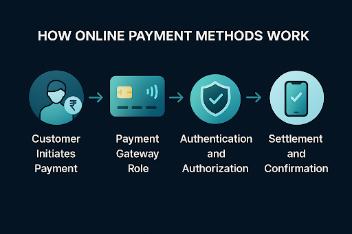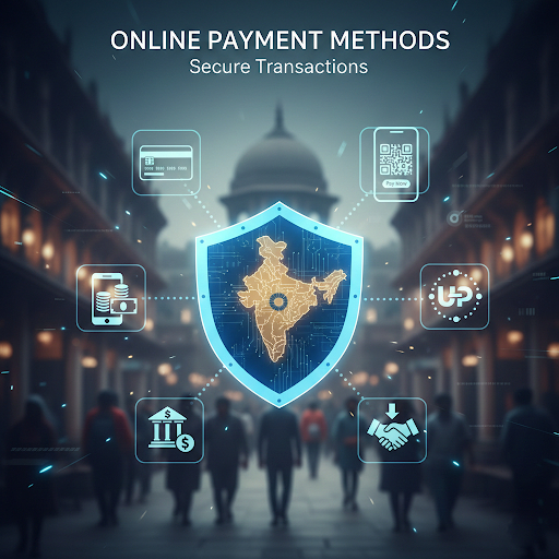 Online payment methods use internet-based platforms to transfer funds. They include UPI apps, wallets, and card-based services. India built strong digital systems through NPCI and RBI-regulated networks.