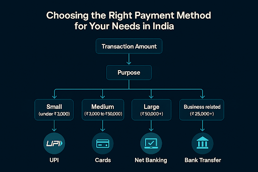 Different payment methods suit different situations based on your transaction amount, how often you pay, and where you are paying.