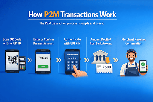 P2M meaning in banking involves a customer paying a merchant using a UPI ID, QR code, or payment link. The transaction is authenticated instantly using a UPI PIN and processed in real time.