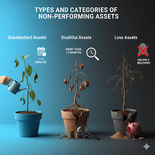 NPAs are categorised by banks and NBFCs according to the duration of non-performing loans. The classification gets worse the longer it is past due.