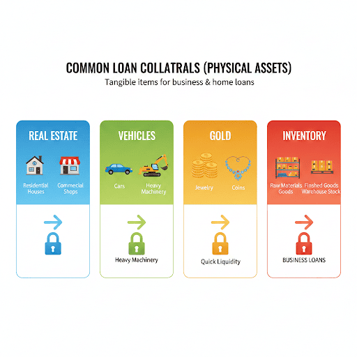 These are physical items you can touch and see. They are common in business and home loans: