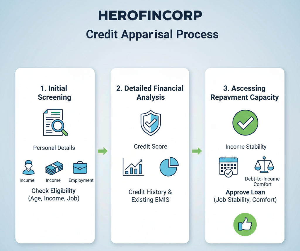 Hero FinCorp follows a structured credit appraisal process designed around clarity and speed. The credit appraisal process combines digital checks with financial reviews to keep evaluations practical and consistent.
