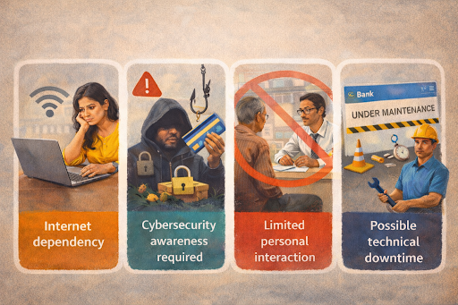Users must remain alert to online fraud attempts. Some customers still prefer face-to-face guidance for complex issues. Occasional technical maintenance may also affect access.