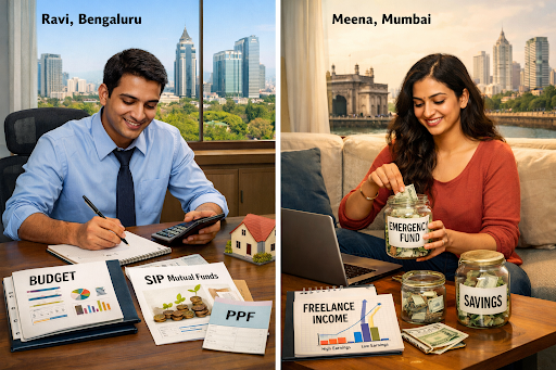 Ravi, a salaried employee in Bengaluru, manages his finances by budgeting his monthly expenses, investing in mutual funds through SIPs and PPF, and paying his home loan EMIs on time.